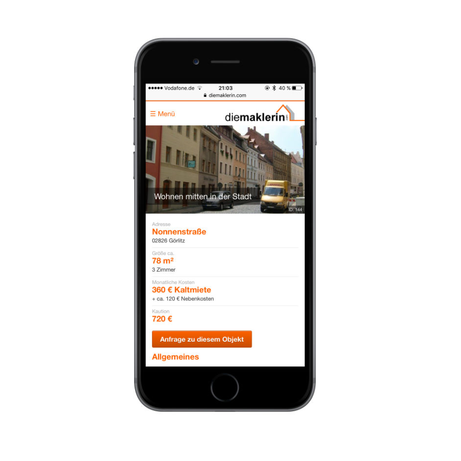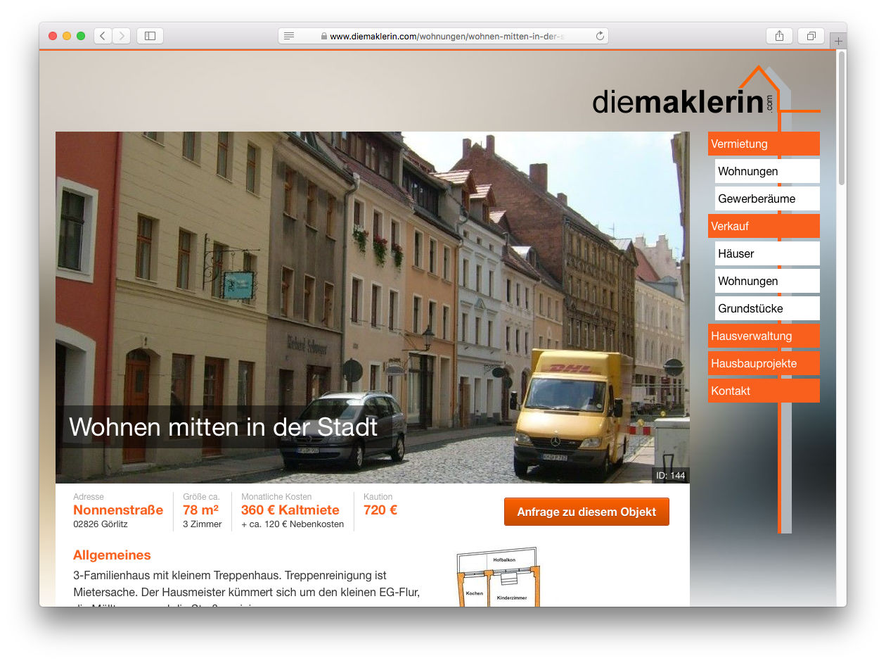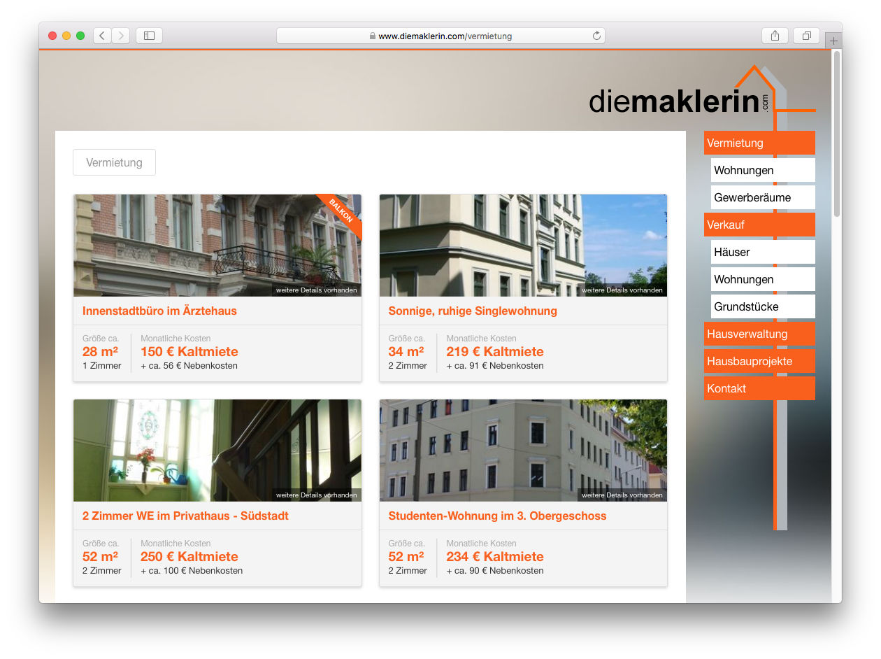 Creating a Real Estate website comes with a unique challenge: Having technical data well structured while presenting them nicely and approachable to regular consumers. Together with "die Maklerin" we developed a custom real estate system that contains just the right amount of data about each listing.